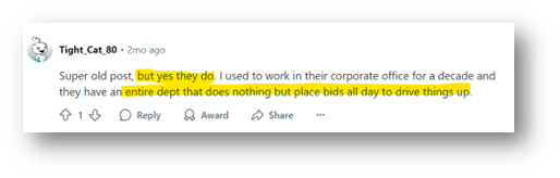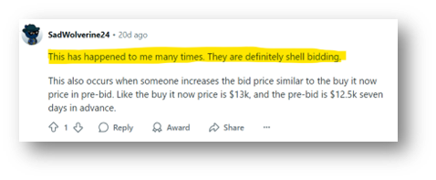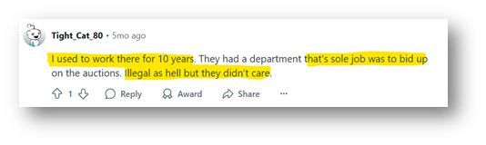 Below is a collection of screenshots of users’ experiences detailing shill-bidding, and even 1 ex-employee claiming they had an entire department dedicated to shill-bidding!