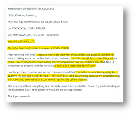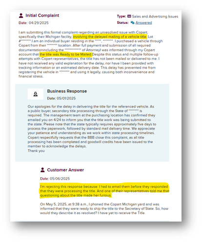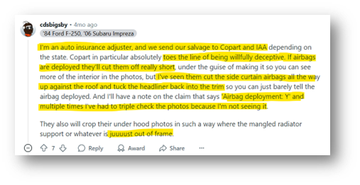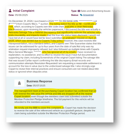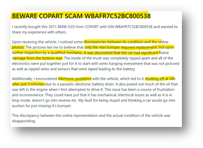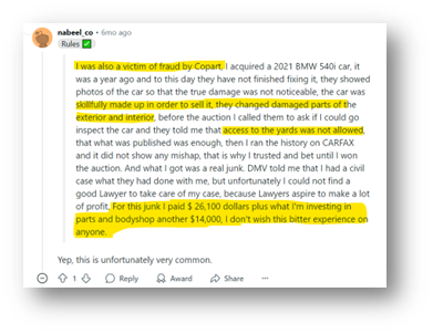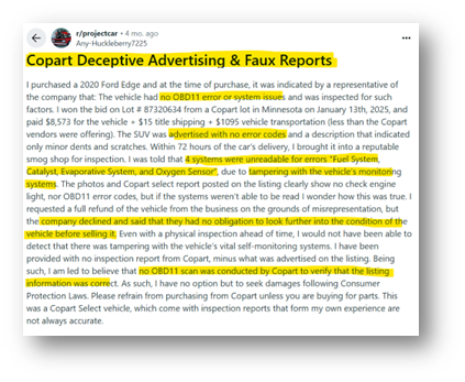 Additionally, countless records of CPRT seemingly tampering with cars to hide damage, selling cars factually worse than listed online, and sometimes with fake titles / wrong titles in the cars (beyond just CPRT selling a “bad used car” - this is material differences in advertising)