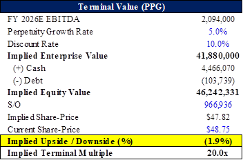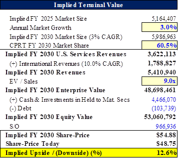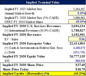 CPRT currently trades at a 9.8x TEV / FY+1 Sales multiple; assuming by 2030E their share erodes from ~61% to ~50%, that should re-enforce the multiple compression thesis and flowing these dynamics into the model at a 7.0x TEV / FY+1 Sales multiple, I see ~25% downside. If CPRT does see their share compress down to ~50%, the market would likely buy-in to the share-loss story to IAA and underwrite their share normalizing back down to ~45%; in this scenario, the multiple likely compresses back down to ~5.0x sales, which leads to ~43% downside. On an EBITDA multiple basis, their current ~21x TEV / FY+1 EBITDA multiple implies ~5% terminal growth; in a world where they are giving up share, it’s hard to see where they aren’t growing at a low-single digits growth rate instead. Assuming a 2.5% terminal growth rate, the implied terminal EBTIDA multiple for CPRT would be ~13.3x, a ~37% decline.