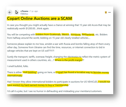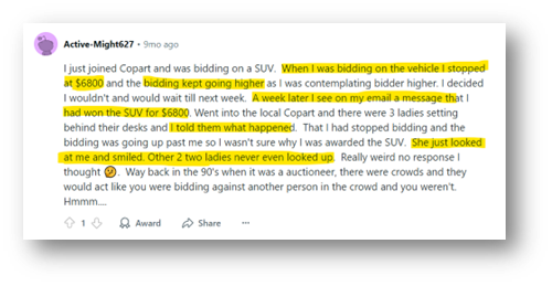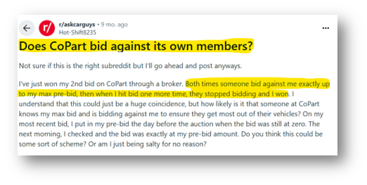 While doing work on the lawsuits above, I came across allegations and accounts of users on Reddit alleging CPRT of shill-bidding, which is defined as “the act of placing bids on an item to artificially inflate its price, desirability, or standing in search results, with no genuine intent to buy it”. Shill-bidding is illegal in many states, and unless explicitly disclosed, would be illegal in CPRT’s case; that being said, irrespective of your view on the “morality” of it, it is something can face scrutiny from regulators.