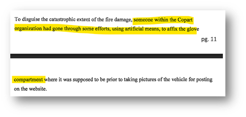 This damage rendered the vehicle completely and entirely useless and dead. Under no circumstances this vehicle, after such catastrophic fire could be started, not to mention "Run Drive" as Copart had claimed on its website. Beyond that, CPRT had potentially made intentional attempts to conceal the extent of the fire damage to this vehicle: