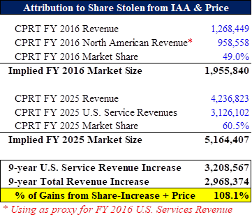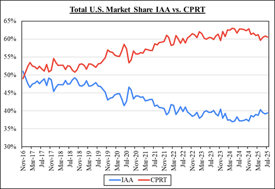 CPRT has increased their share of the total industry from 41.0% to 60.5% over November 2016 to today per 3P data, primarily due to weakness in IAA (no functioning website, etc.). Now that IAA, under new ownership, has rectified these issues, insurance companies WANT to have EQUAL SHARE amongst the 2 largest salvage vehicle providers, and are going to the main driving force in share normalizing: