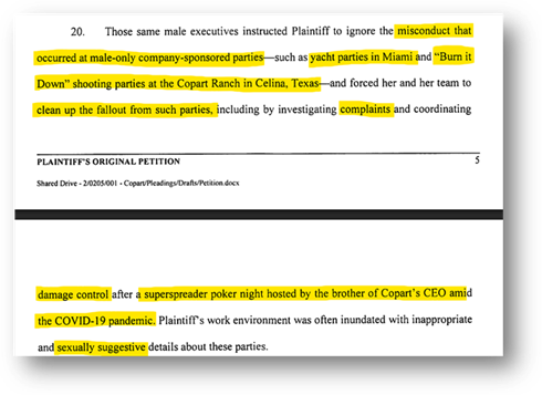 This lawsuit also exposes suggestive male-only Yacht parties in Miami, and the “Burn it Down” shooting parties at the Copart Ranch in Celina, Texas - there was also a “superspreader poker night hosted by the brother of Copart’s CEO amid the COVID-l9 pandemic” where she was required to do damage control (take a guess as to what “damage” had to be controlled…):