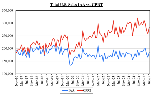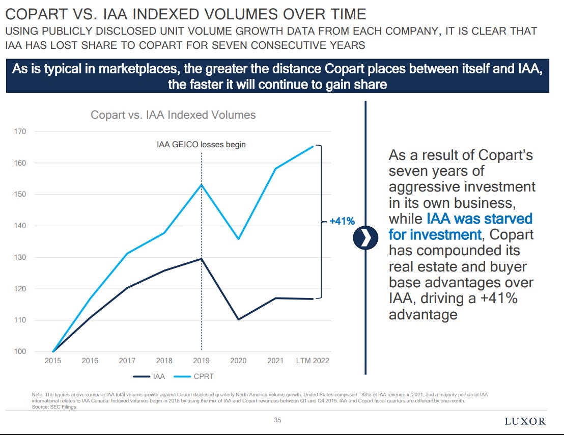 The insurance companies shifting to CPRT over the last 10 years was more out of a **necessity** factor given the issues at IAA (if your website isn’t even functioning, you aren’t selling as many cars, and in turn, insurance companies are losing money as hosting cars on lots are very expensive).