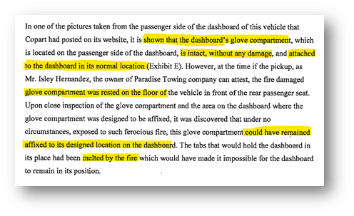 After the purchase, at the time and location of the pickup, the plaintiff found that the purchased vehicle actually had catastrophic fire damage to the vehicle's dashboard and the dashboard's underbelly, where most of the vehicle's electronics as well as other electrical/mechanical components are located.