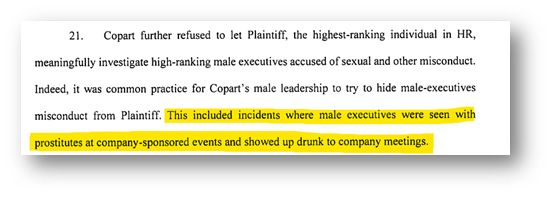 Anyways, CPRT’s response to this was to argue the definition of sexual harassment…no surprise that their motion to dismiss was denied (note, none of the allegations were admitted being false, so we can likely assume what the plaintiff stated about showing up to company meetings drunk + prostitutes at company events as true).