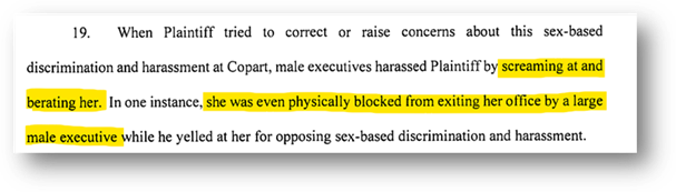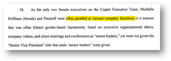 “At the time of Plaintiff’s termination, Copart had zero women in the C-Suite, only two women on its 11—member Board, and just three of 27 Vice Presidents were female. Indeed, Copart was the very last of the S&P 500 companies to have female board member, and its first and My female C-Suite executive in company history was not appointed until 2022”