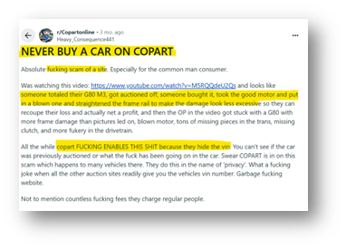 Below is a collection of some customer reviews across Reddit and the BBB that give more color on what might be going on – this seems to go beyond just “oh CPRT sold me a bad car that I didn’t know was a salvage car!” but outright wrong information when looking up the cars VIN; some users found CPRT had the wrong title information / car accident history based off the VIN! If more widespread, this would mean a good chunk of CPRT’s business today relies more on exploiting customers beyond just pricing power, and ought to be investigated: